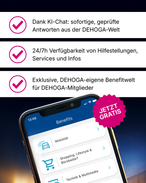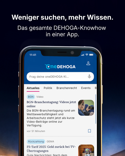 Genau hier setzt die oneDEHOGA-App an: Sie bündelt erstmals das gesamte DEHOGA-Wissen in einem schlanken, modernen Werkzeug. Informationen müssen nicht mehr mühsam gesucht werden, sondern stehen dank KI-Technologie gezielt, aktuell und sofort zur Verfügung.