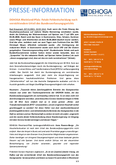 Jetzt hat das Bundesverfassungsgericht die Umwidmung von 60 Mrd. Euro aus dem Corona-Sondervermögen durch die Bundesregierung - auf Drängen der Grünen - in einen Klima- und Transformations-Fond (KTF) für verfassungswidrig erklärt. Das Gericht hat damit der Bundesregierung ein vernichtendes Arbeitszeugnis ausgestellt. Und jetzt steht die Ampel-Regierung vor hausgemachten haushaltsrechtlichen Problemen. Und genau diese „Fehlerkorrektur“ soll nun das deutsche Gastgewerbe ausbaden und die in Aussicht gestellte und längst überfällige Steuergerechtigkeit nicht erhalten.